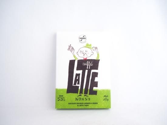 サバディ史上初のミルク チョコレート、アル ラッテ(al latte)シリーズ!!カカオの比率が高かったり、カカオ 由来の油脂(カカオバター)以外を使用していなかったりする本格的(?)なチョコレートを好きだという人であ ればあるほど、ミルクチョコレートのことを低く見る傾向があることに疑問を感じたシモーネ。質の良い素材を 使いちゃんと作ったのなら、カカオの個性をちゃんと引き出したミルクチョコレートを実現することが可能であ ることを世に認めてもらうために作ることにしたシリーズになります。6種類ありそれぞれ家族をイメージした デザインになっていて、使用する粉乳とカカオバター、コーヒーも生姜もビオ認証のものです。
