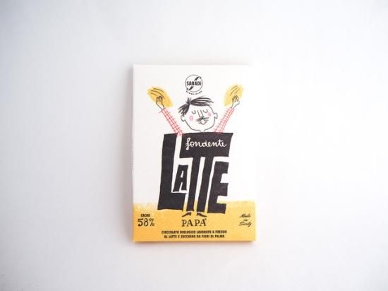 サバディ史上初のミルク チョコレート、アル ラッテ(al latte)シリーズ!!カカオの比率が高かったり、カカオ 由来の油脂(カカオバター)以外を使用していなかったりする本格的(?)なチョコレートを好きだという人であ ればあるほど、ミルクチョコレートのことを低く見る傾向があることに疑問を感じたシモーネ。質の良い素材を 使いちゃんと作ったのなら、カカオの個性をちゃんと引き出したミルクチョコレートを実現することが可能であ ることを世に認めてもらうために作ることにしたシリーズになります。6種類ありそれぞれ家族をイメージした デザインになっていて、使用する粉乳とカカオバターもビオ認証のものです。