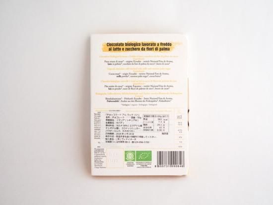 【カカオ 58%(エクアドル産ナシオナル種)、ココナッツシュガー、 パウダーミルク、カカオバター、天日塩】